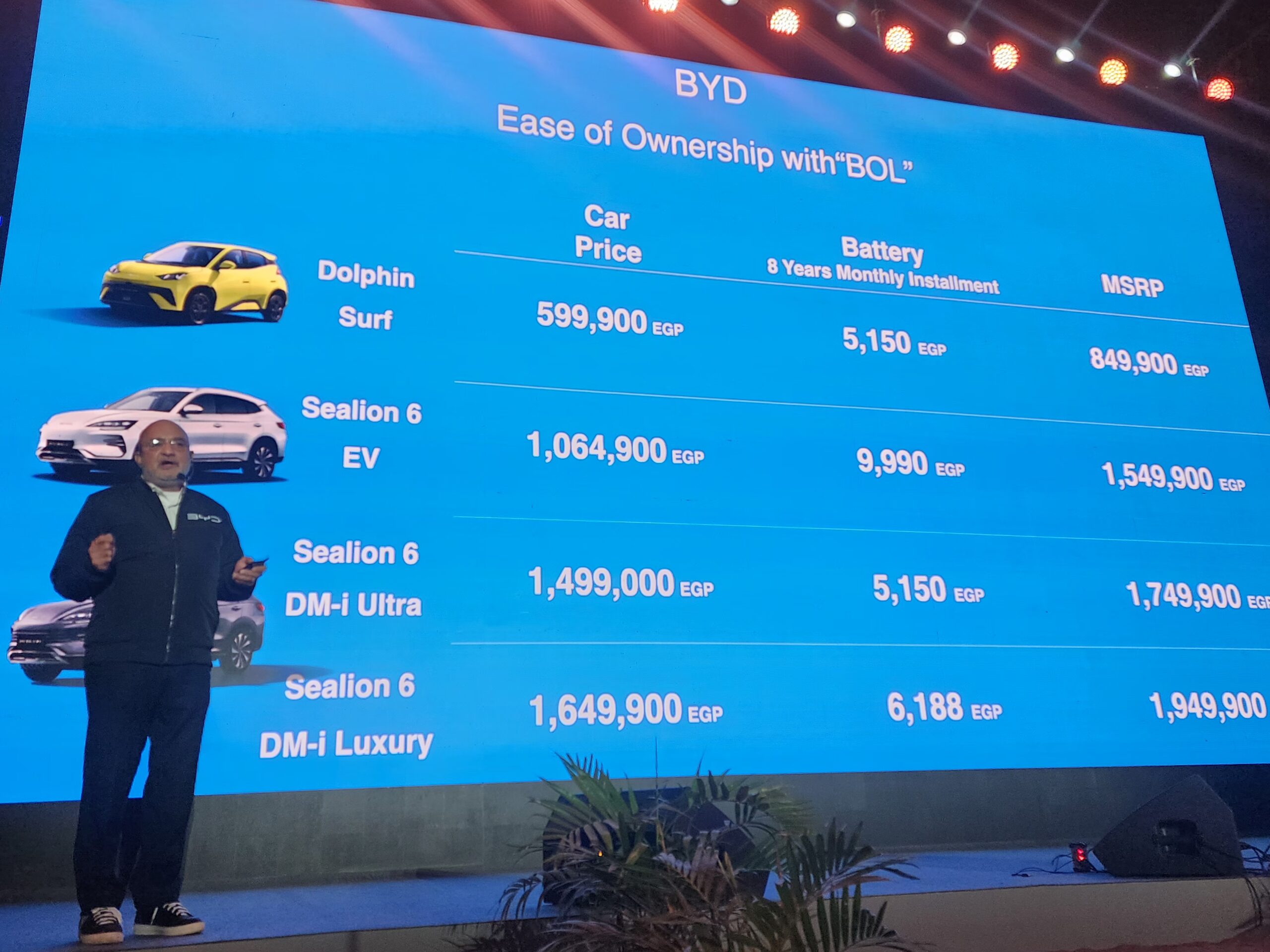 كما تضمنت القائمة طراز Sealion 6 EV الكهربائي بالكامل، والذي طُرح بسعر 1,064,900 جنيه دون البطارية، مع قسط شهري للبطارية يصل إلى 9,990 جنيهًا، بينما يبلغ السعر الرسمي الكامل للسيارة 1,549,900 جنيه، لتقدم السيارة مزيجًا من الأداء الكهربائي والتجهيزات الحديثة في فئة السيارات متعددة الاستخدامات.