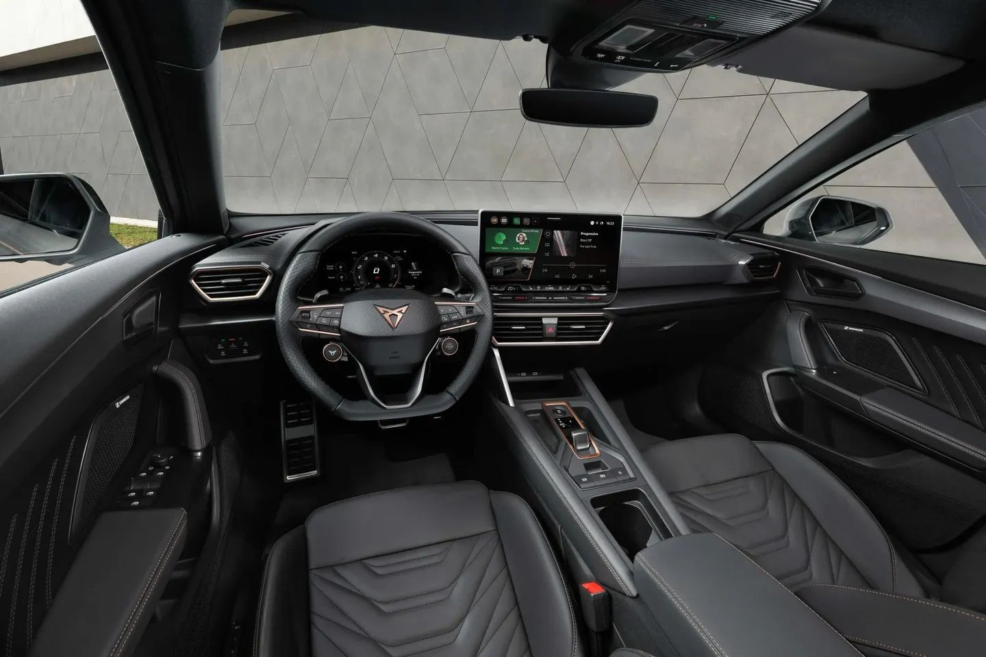 داخل السيارة، حصلت كوبرا فورمينتور 2026 على شاشة مركزية 12.9 بوصة، مع برامج تشغيل محسّنة ودعم كامل لـ Apple CarPlay وAndroid Auto. المقاعد رياضية مع دعم جانبي، وعجلة قيادة متعددة الوظائف بشعار CUPRA، وإضاءة محيطية متعددة الألوان، ونظام تكييف أوتوماتيكي، وفتحات تكييف خلفية، ومساحات تخزين متعددة.